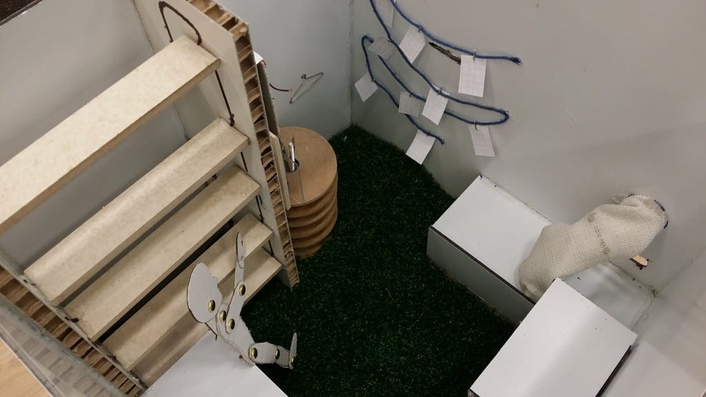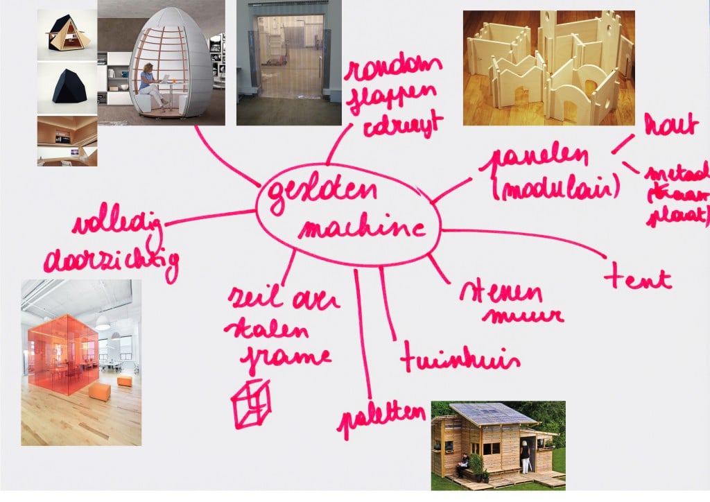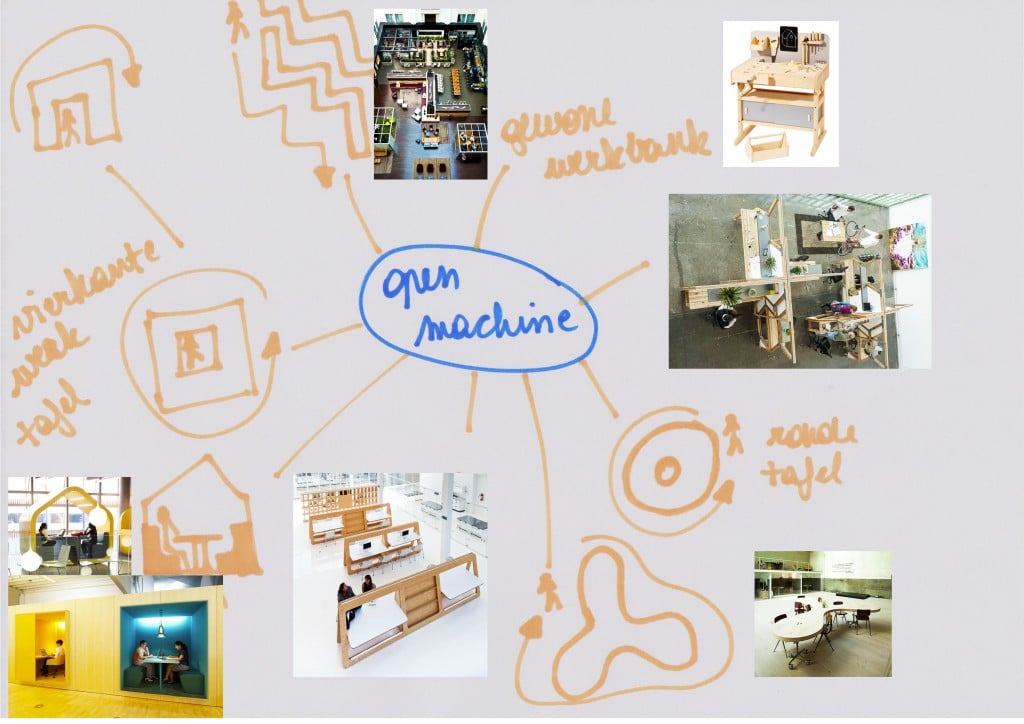 Concept: De allesmaker is een machine die werkt op mensenkracht. Gooi rommel erin via de prullenvanger. De rolband geeft de prullen door naar de werkbank, waar een ander kind aan de slag kan om iets leuks in elkaar te knutselen. Buiten kan iemand stiekem via de kijkgaten het hele proces volgen. Voortaan maak je iets moois van je eigen rommel!